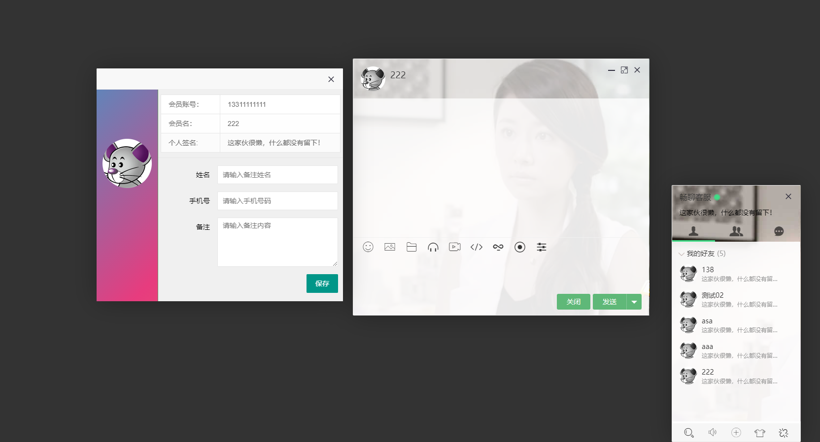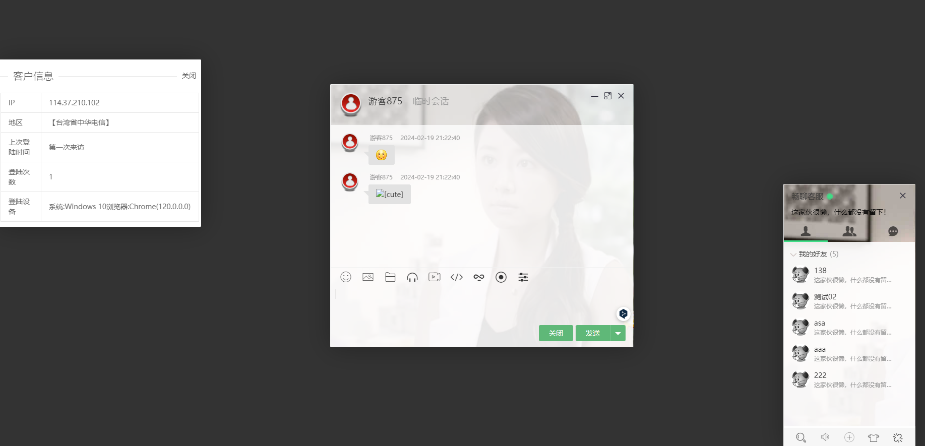 现产品有自动回复,支持评价,支持聊天,支持自动双向翻译,有换肤,备注,地区显示,PC手机自适应!支持嵌入到你的网站!注意,本软件很多功能折叠在内页,支持游客来源显示备注等等,配合https可以获取客户地理位置等等。
